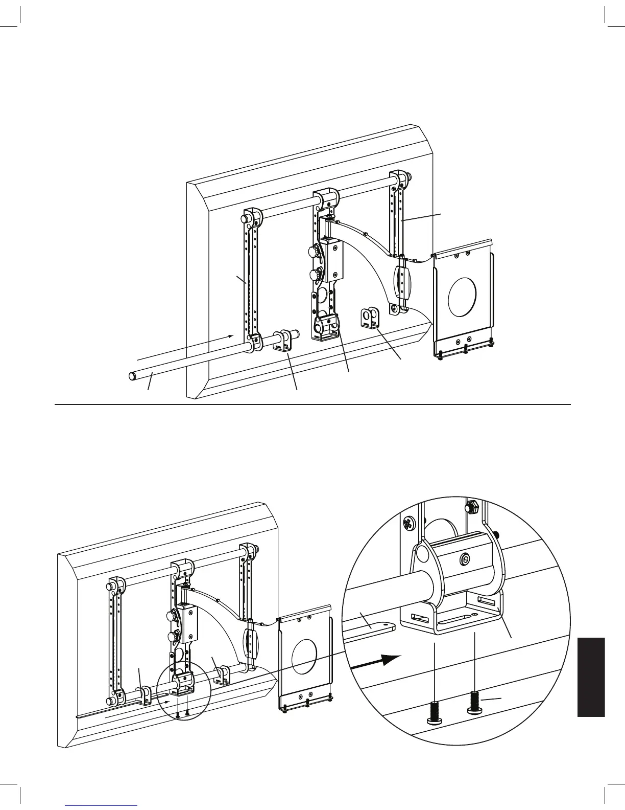 将下方横管穿过杆托架 (e)、轴装配体、第二个杆托架和第二个显示器架。横管穿过第二个显示器架后旋紧所有三个虎钳组