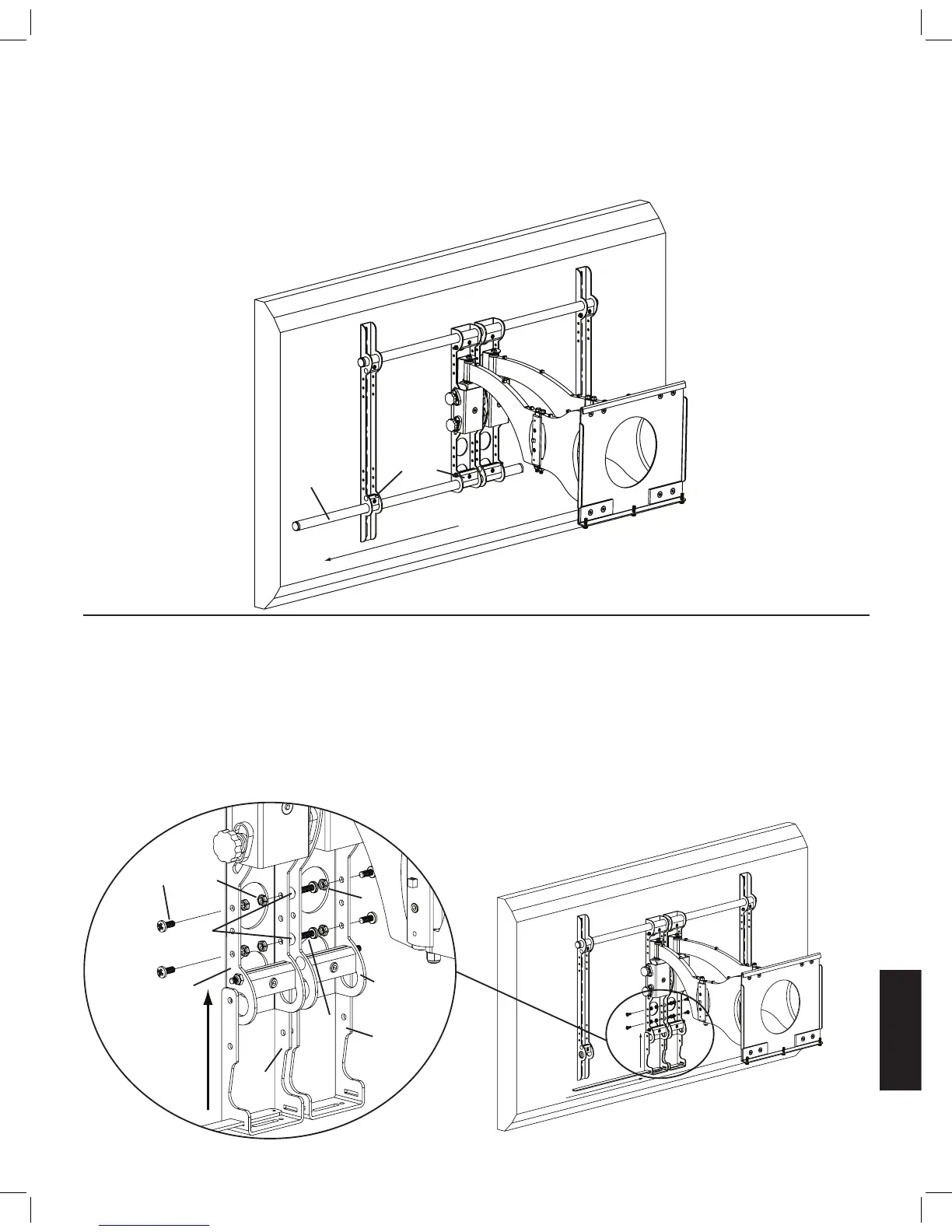 旋入到 1/4 20 螺母中。将支撑杆穿过每个轴托架上的槽,最后位于墙架中间。请参见下面的图 8。