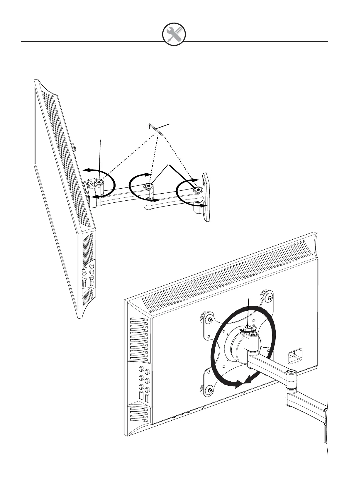 A: Adjust arm extension tension. B: Adjust left/right/rotation swivel tension.