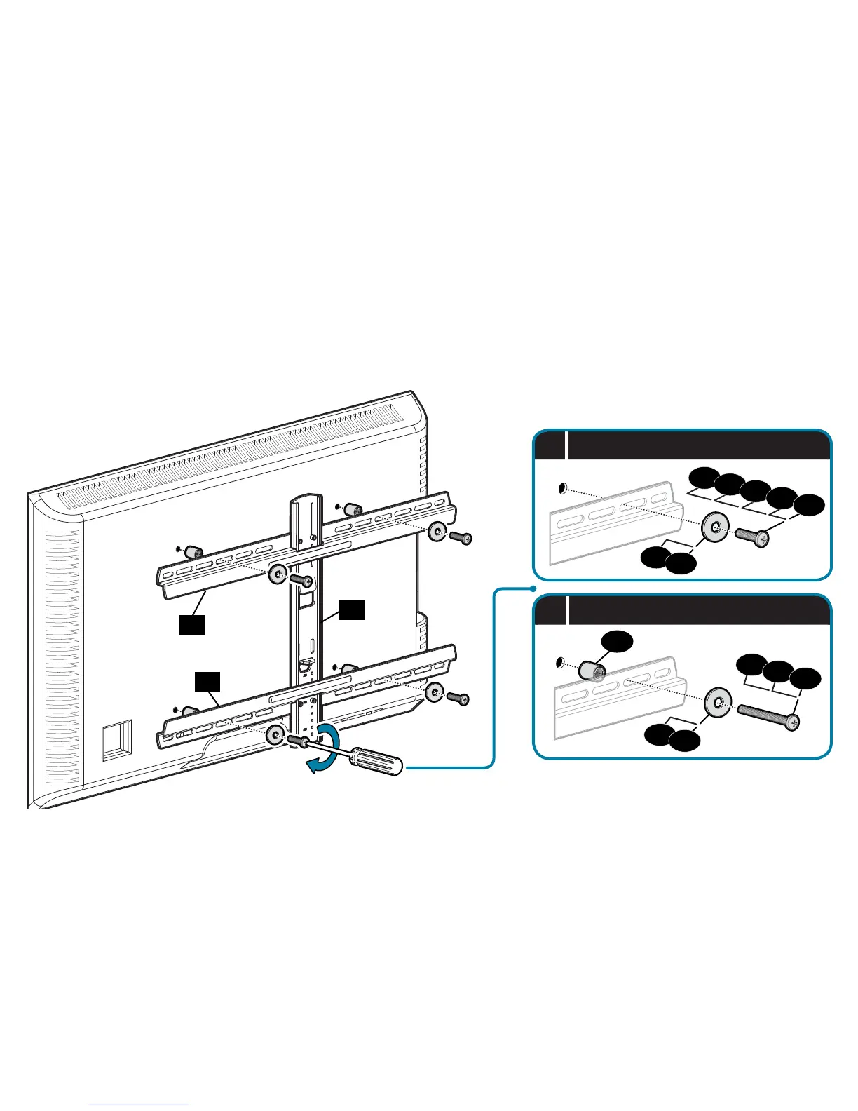 Attach the TV bracket assembly using either the short screw and washer or spacer, long screw and washer combination you selected for your TV.