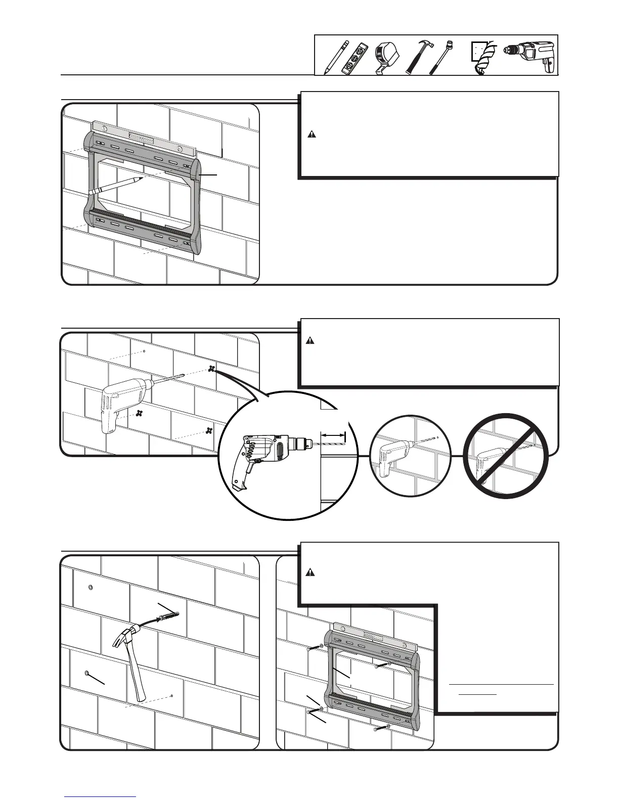Ù Never drill into the mortar between blocks.