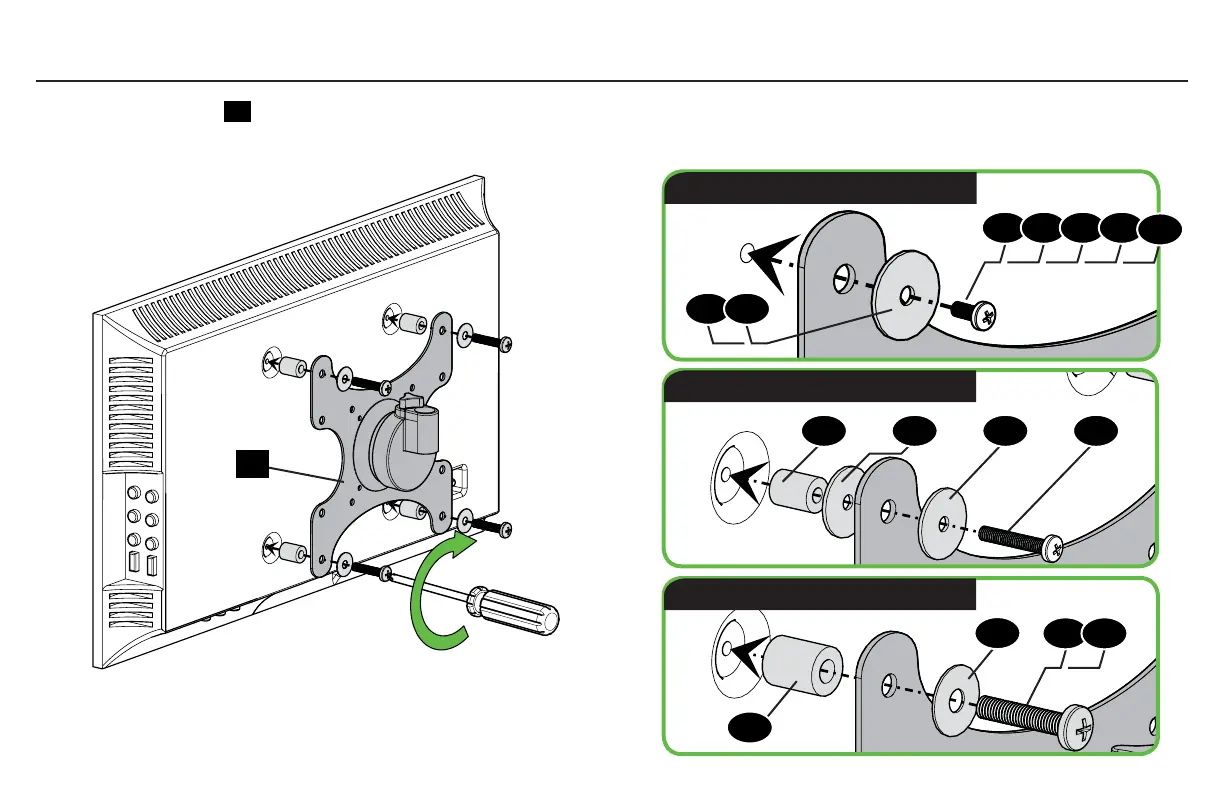over your TV hole pattern and install using the screw, washer, and spacer (if needed) combination you selected for