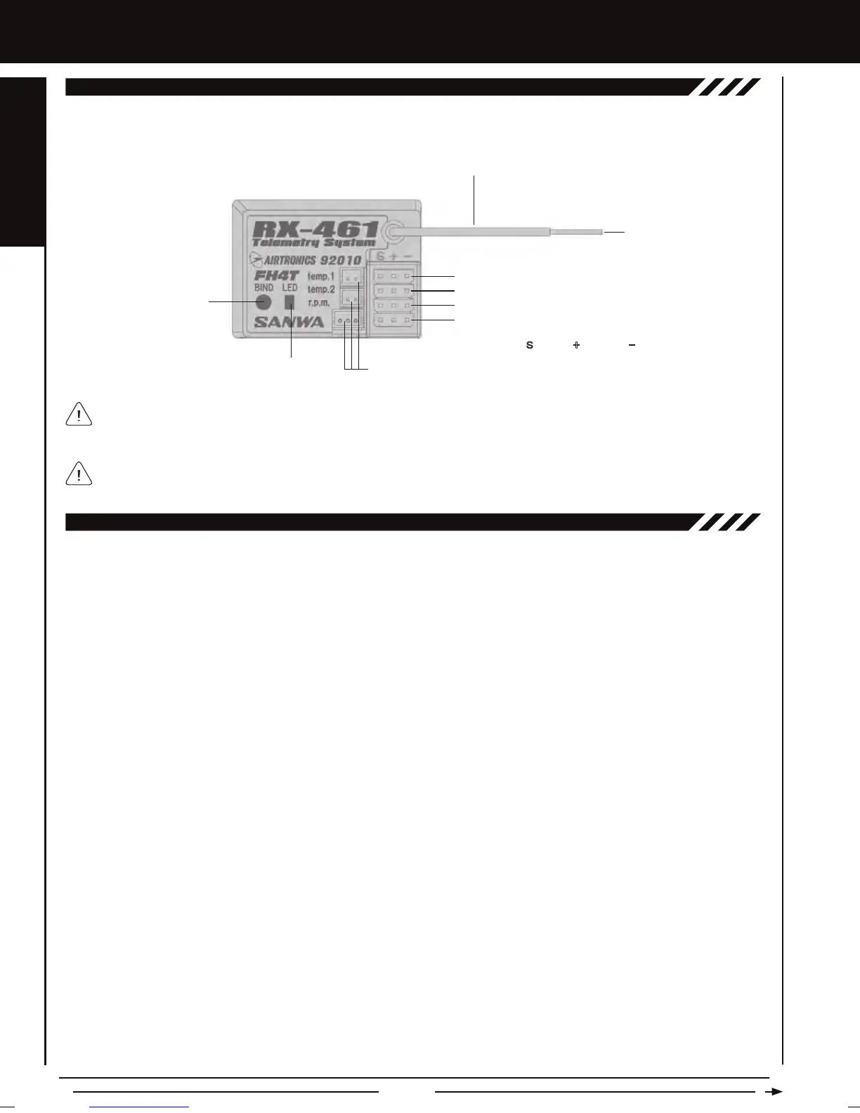 Use the diagram below to familiarize yourself with the RX-461 4-Channel 2.4GHz FHSS-4T Telemetry receiver included with