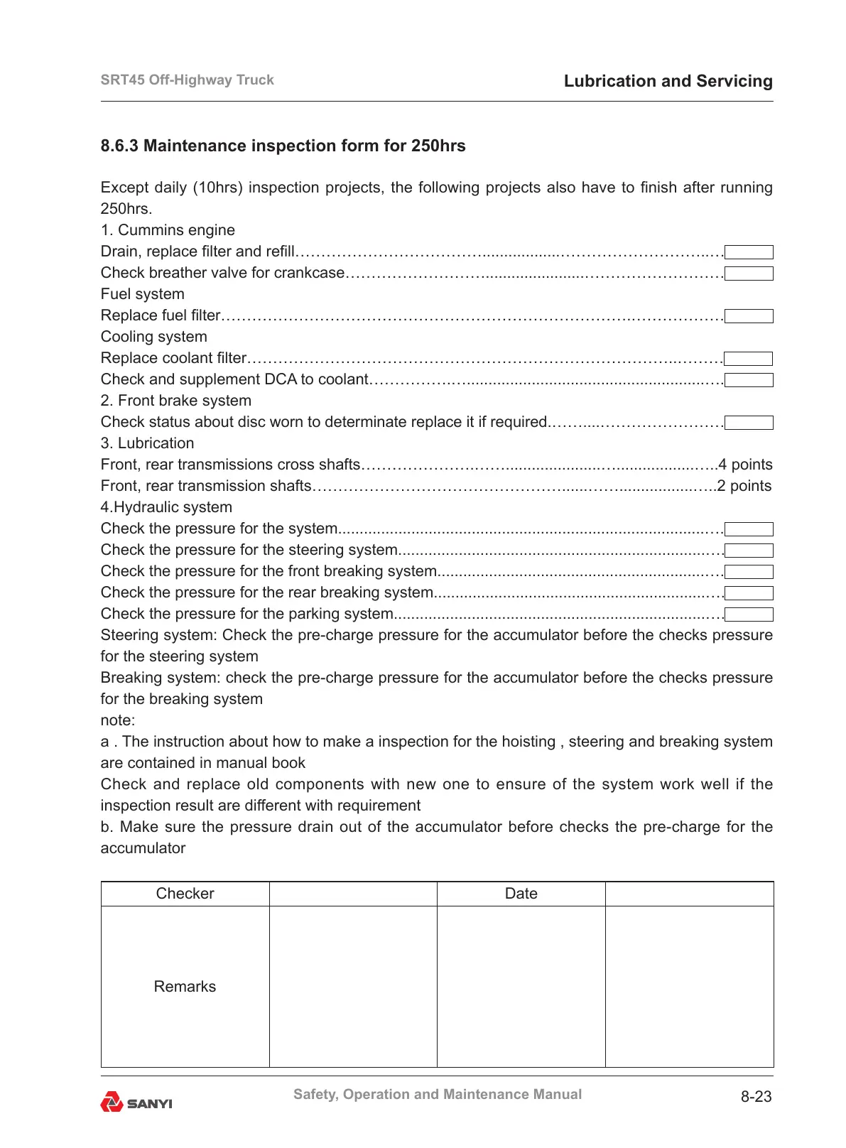 8.6.3 Maintenance inspection form for 250hrs