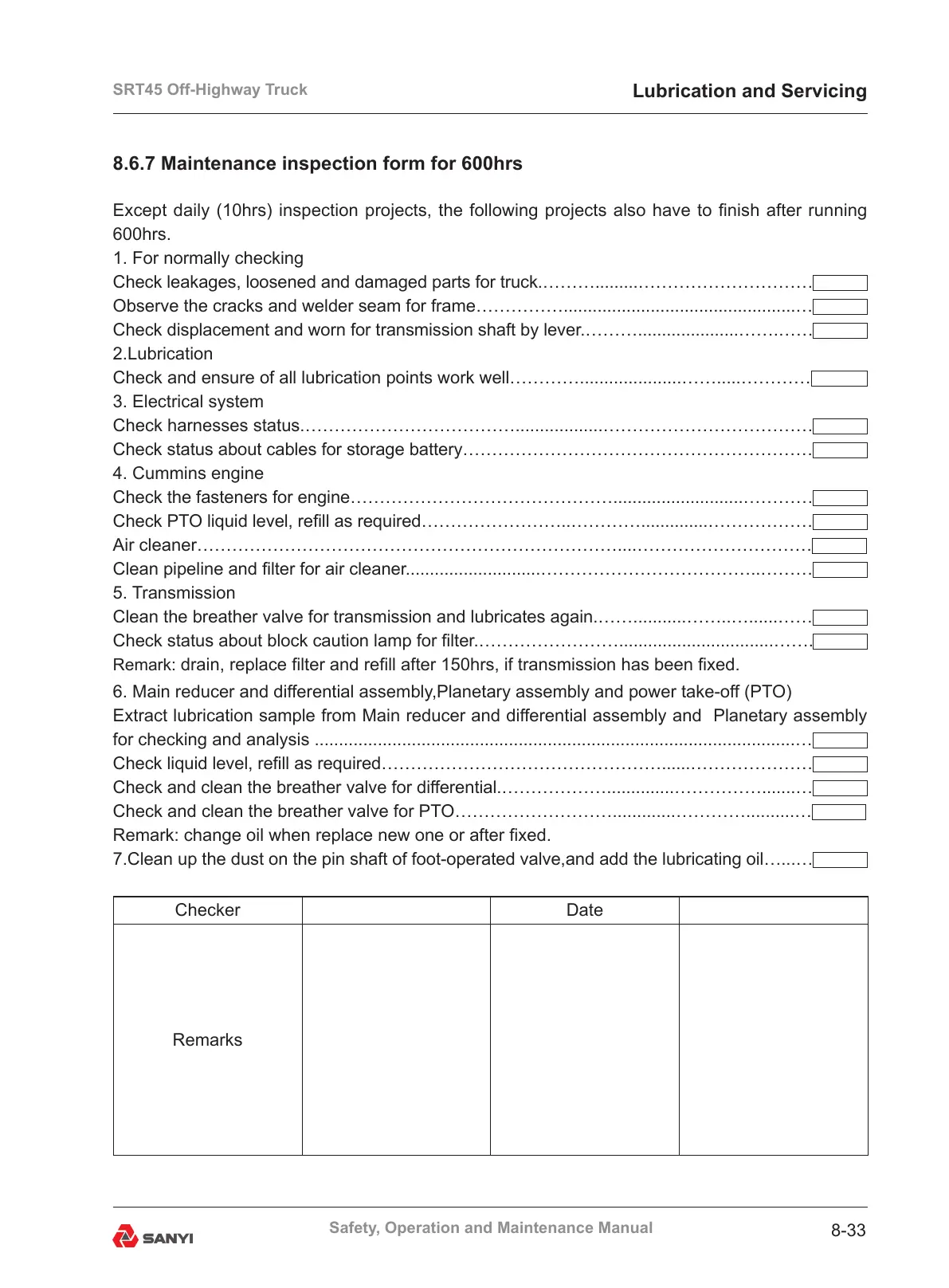 8.6.7 Maintenance inspection form for 600hrs