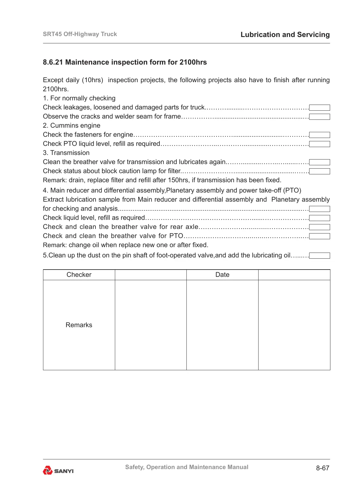 8.6.21 Maintenance inspection form for 2100hrs