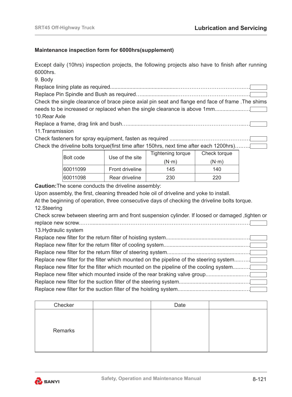 Check the driveline bolts torque(rst time after 150hrs, next time after each 1200hrs)….…..