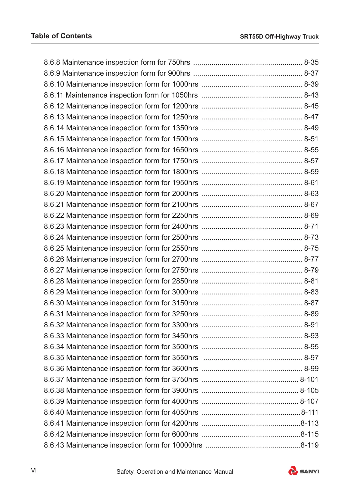 8.6.8 Maintenance inspection form for 750hrs ...................................................... 8-35