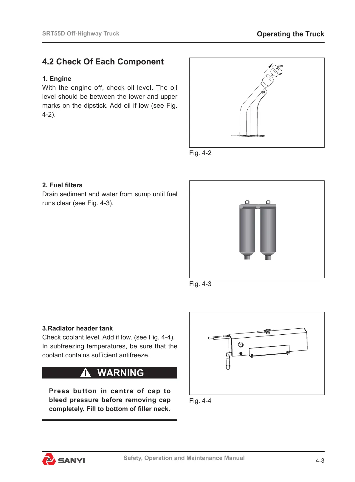Check coolant level. Add if low. (see Fig. 4-4).
