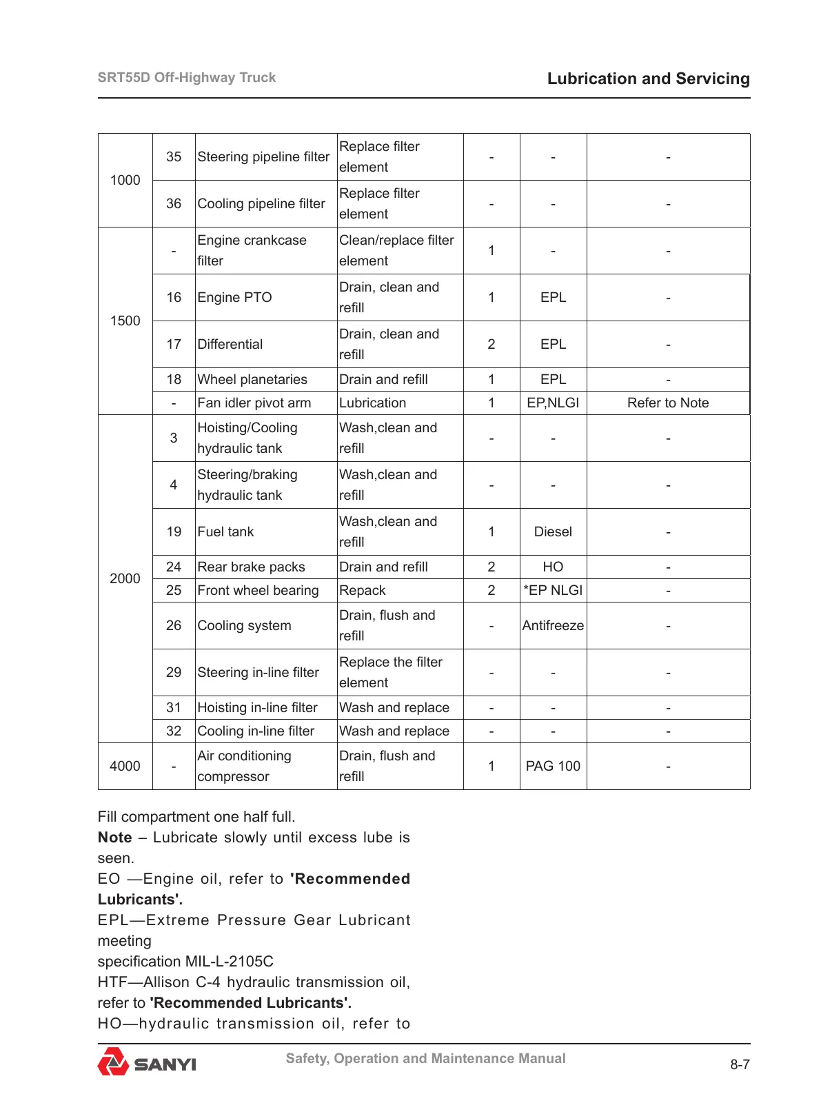 - Fan idler pivot arm Lubrication 1 EP,NLGI Refer to Note