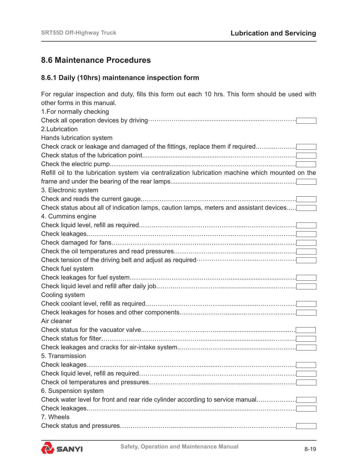 8.6.1 Daily (10hrs) maintenance inspection form