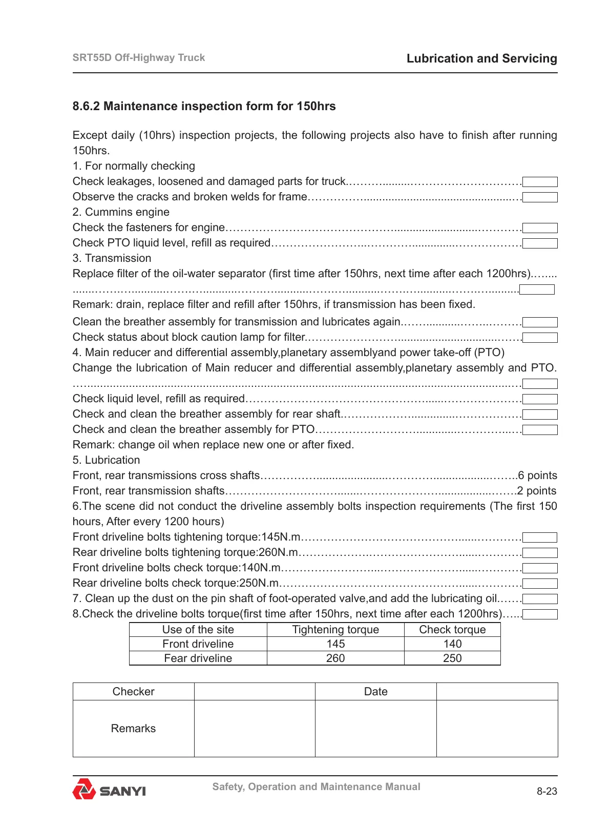8.6.2 Maintenance inspection form for 150hrs