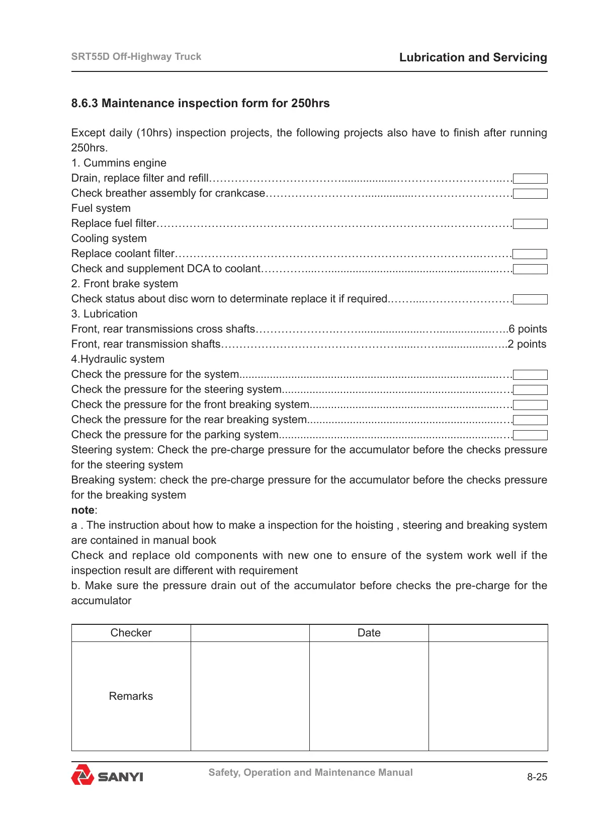 8.6.3 Maintenance inspection form for 250hrs
