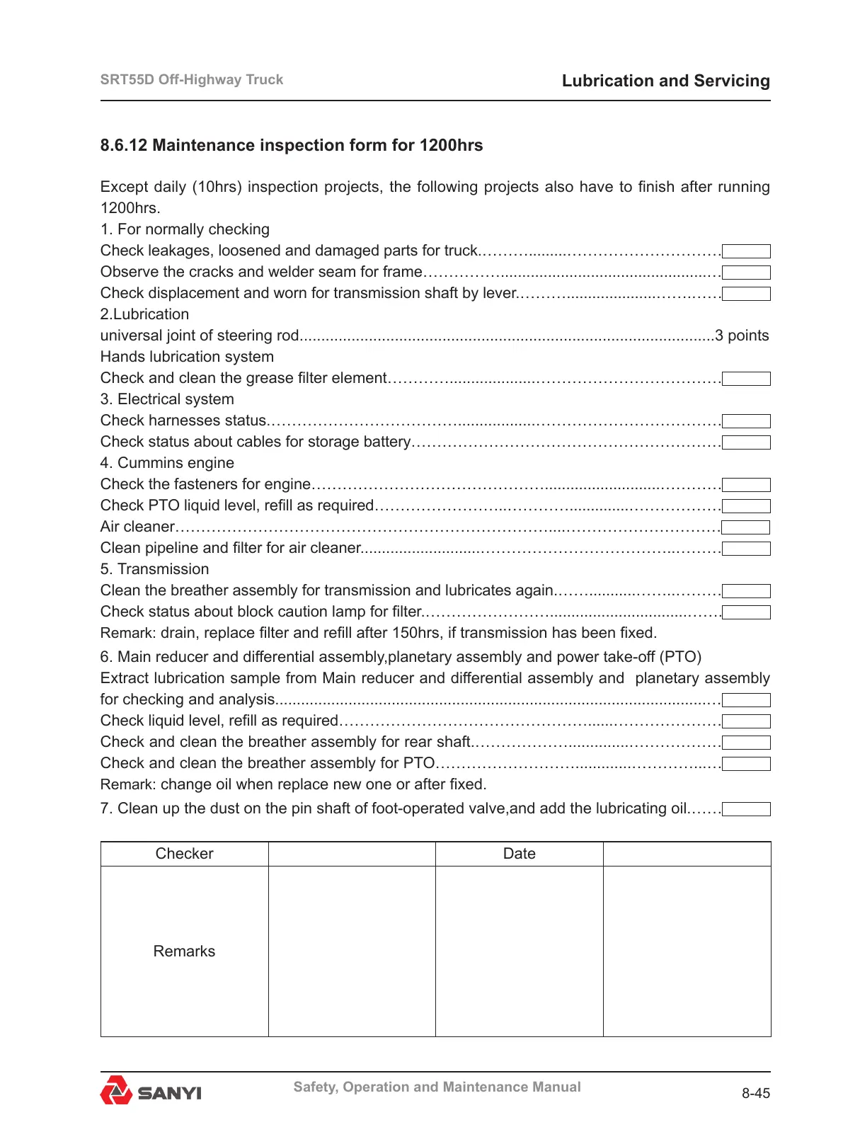 8.6.12 Maintenance inspection form for 1200hrs