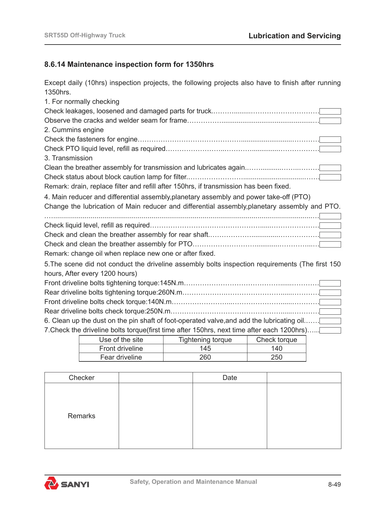 8.6.14 Maintenance inspection form for 1350hrs