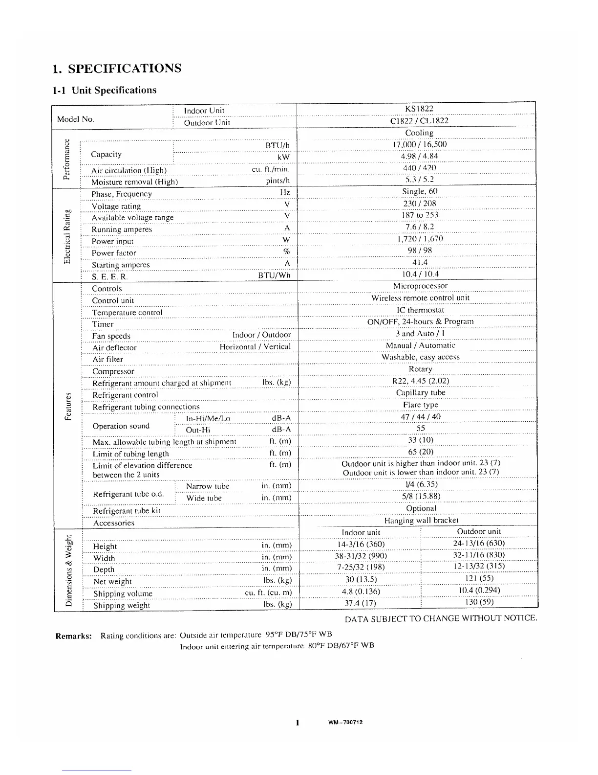Sanyo C1822 - 1. SPECIFICATIONS; 1-1 Unit Specifications; 1-2 Major Component Specifications; 1-3 Other Component Specifications