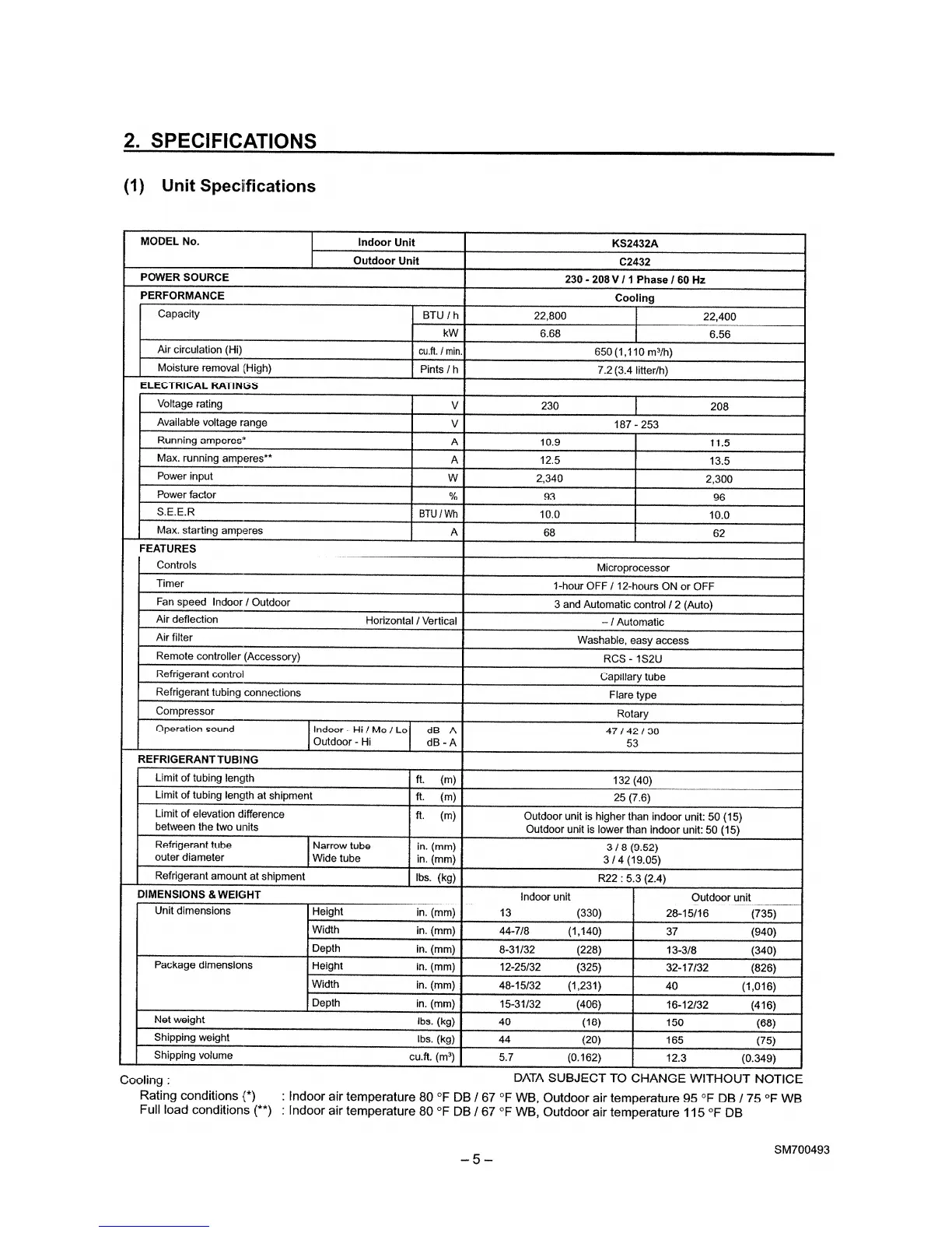 Sanyo CL2432 - 2. SPECIFICATIONS; Unit Specifications