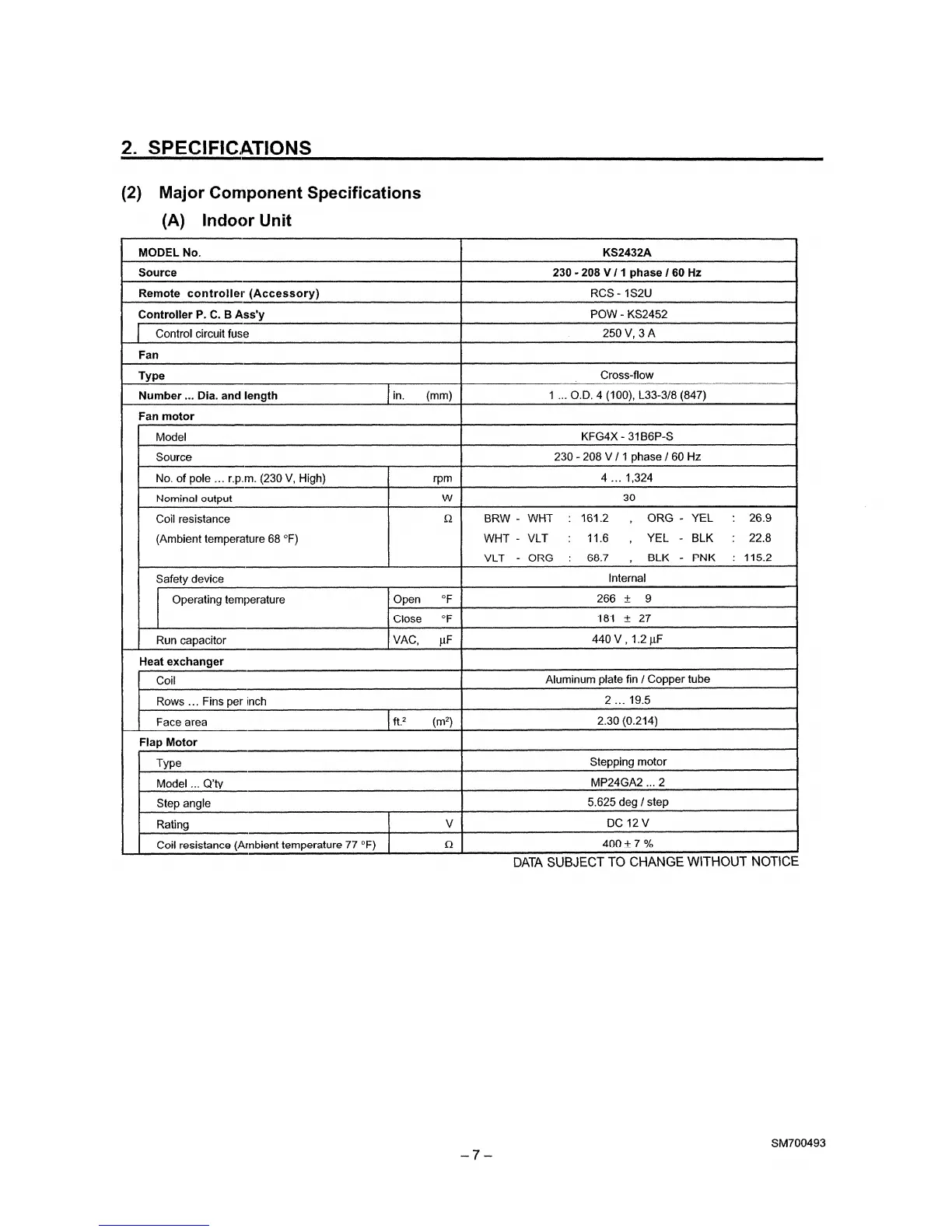 Sanyo CL2432 - Major Component Specifications - Indoor Unit