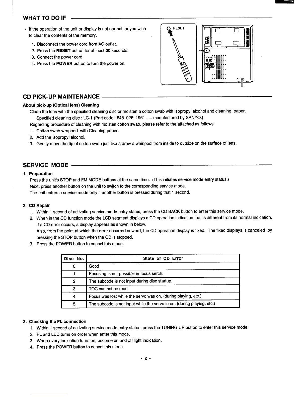 Specified cleaning disc: LC-1 (Part code: 645026 1961 ..... manufactured by SANYO.)