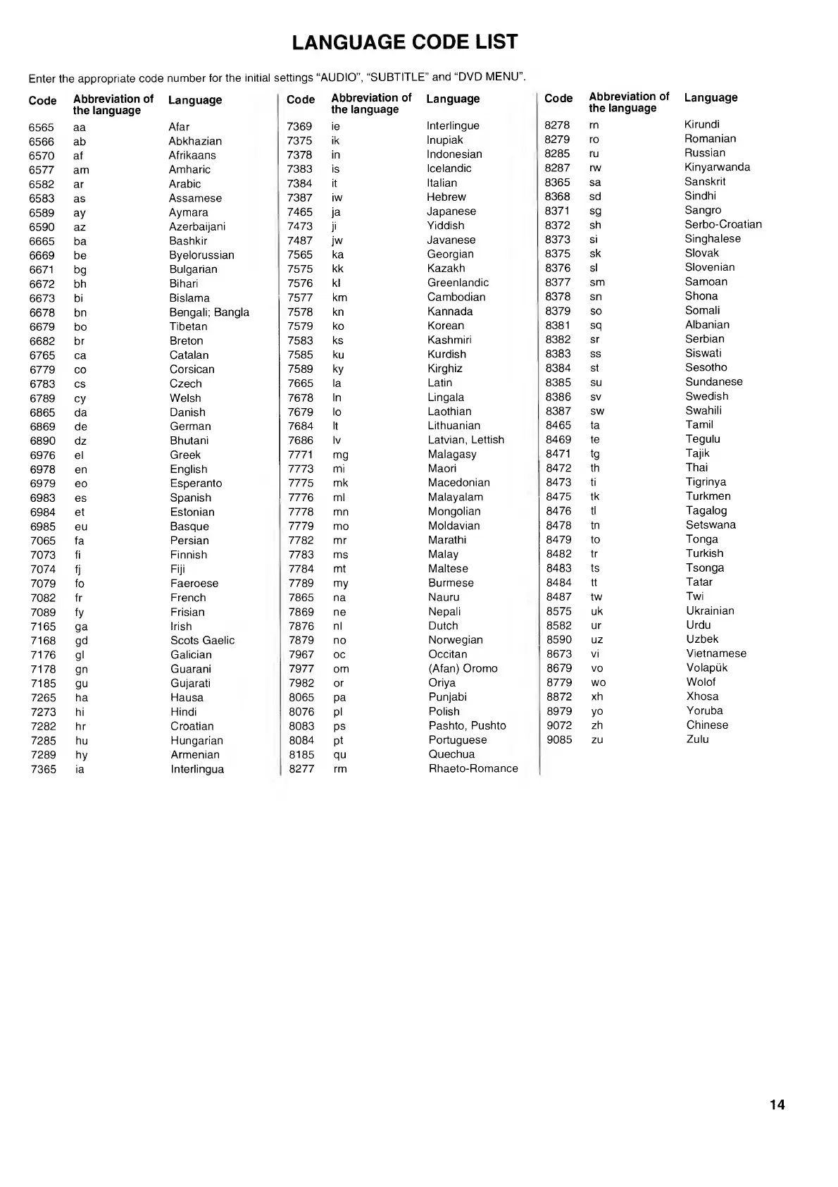 Sanyo DC-DAV821 - LANGUAGE CODE LIST; Reference for Language Codes