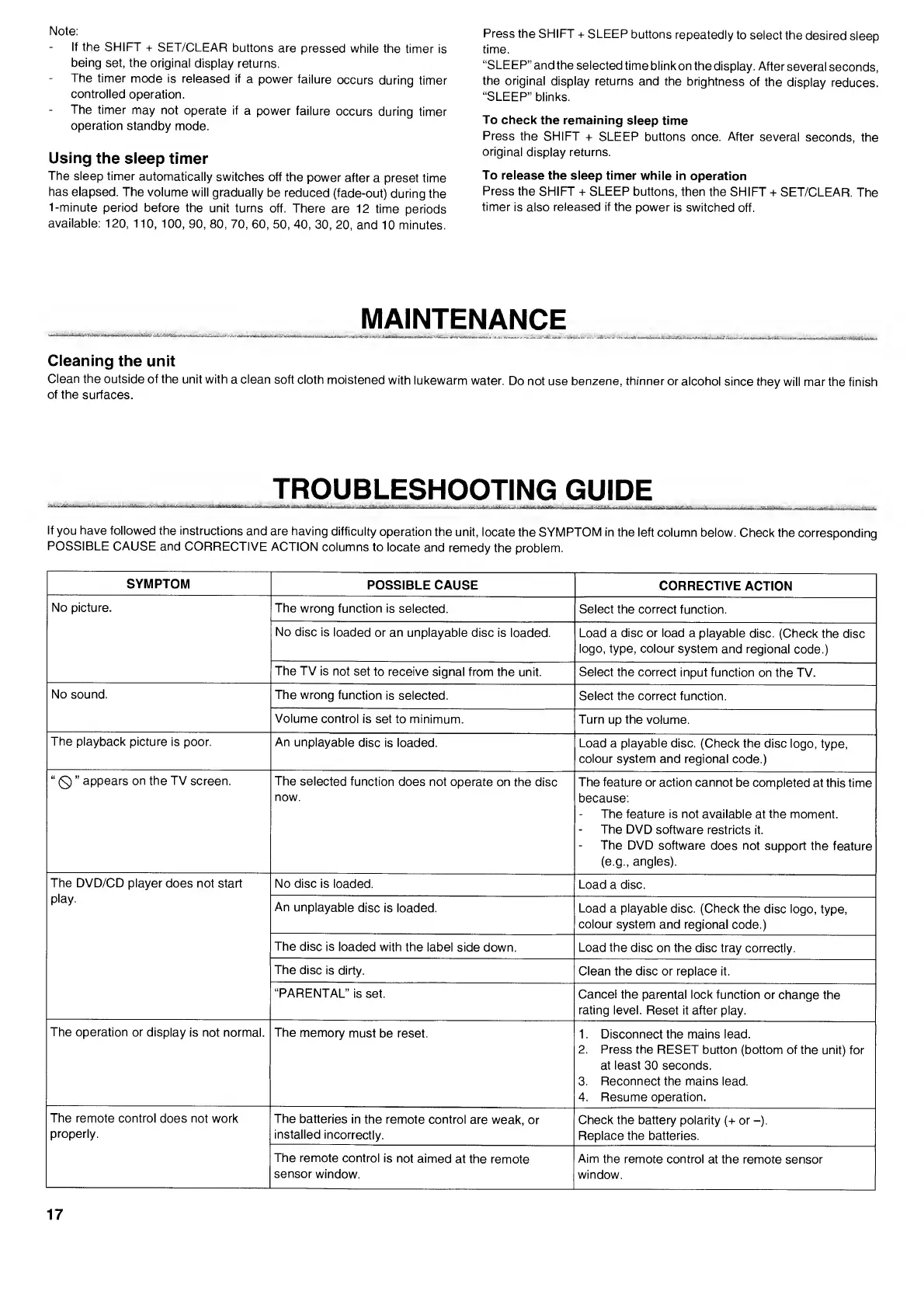 Sanyo DC-DAV821 - MAINTENANCE AND TROUBLESHOOTING; Unit Cleaning and Care; Troubleshooting Common Issues