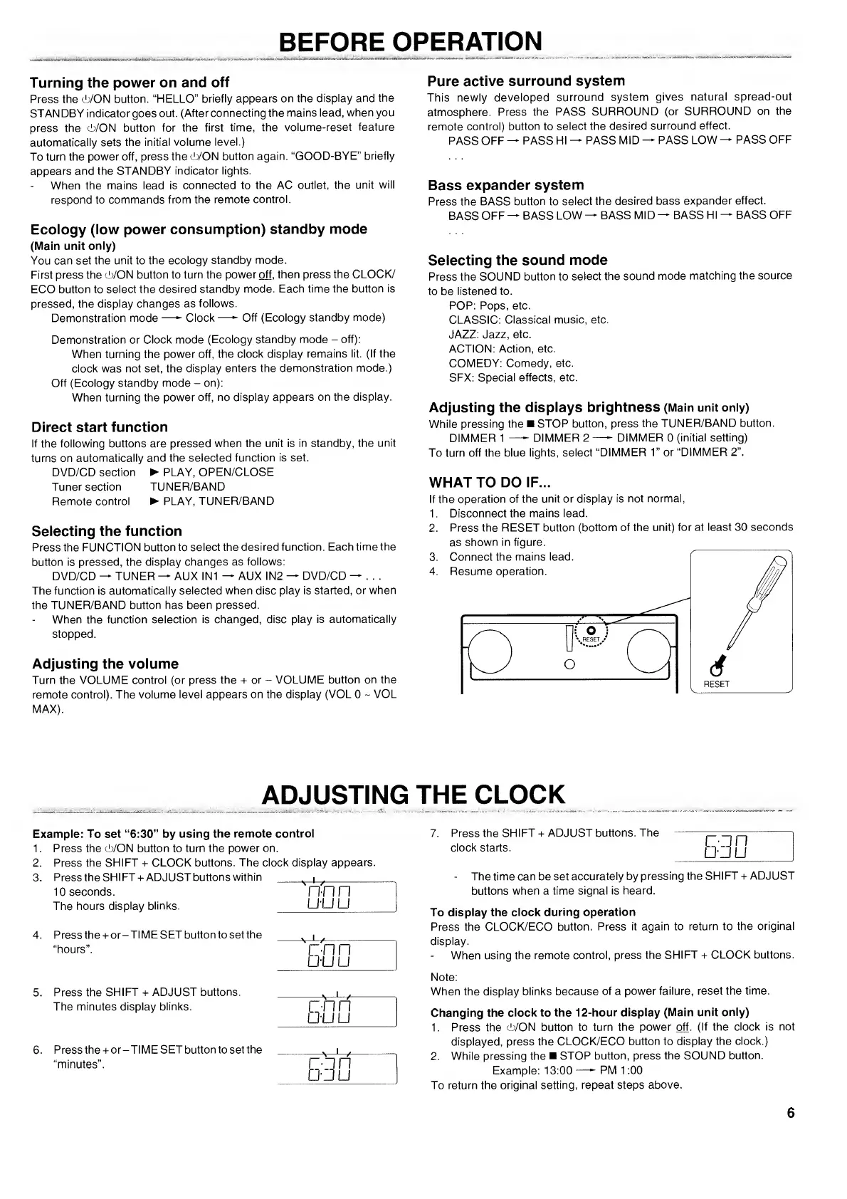 Sanyo DC-DAV821 - BEFORE OPERATION AND SETUP; Powering and Standby Modes; Clock Setting and Basic Functions; Troubleshooting Initial Problems