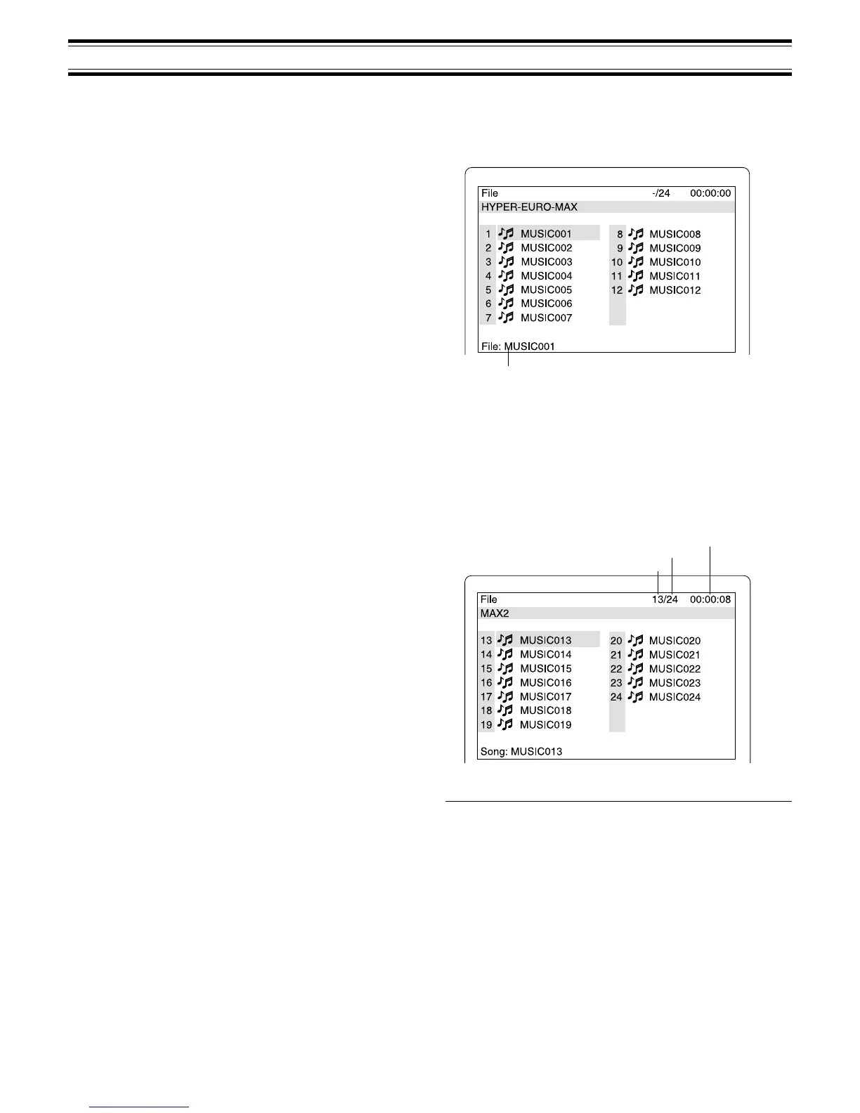 “FILE LIST” appears on the display and a table of contents in the first