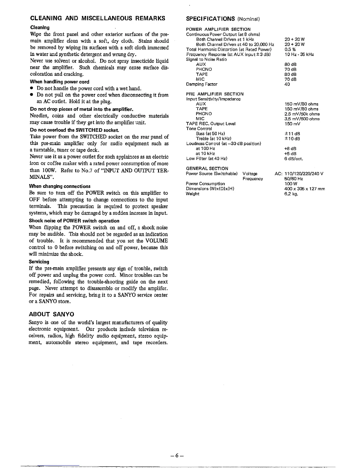 Sanyo DCA 401 - Cleaning and Miscellaneous Remarks; Specifications; When Handling Power Cord; When Changing Connections