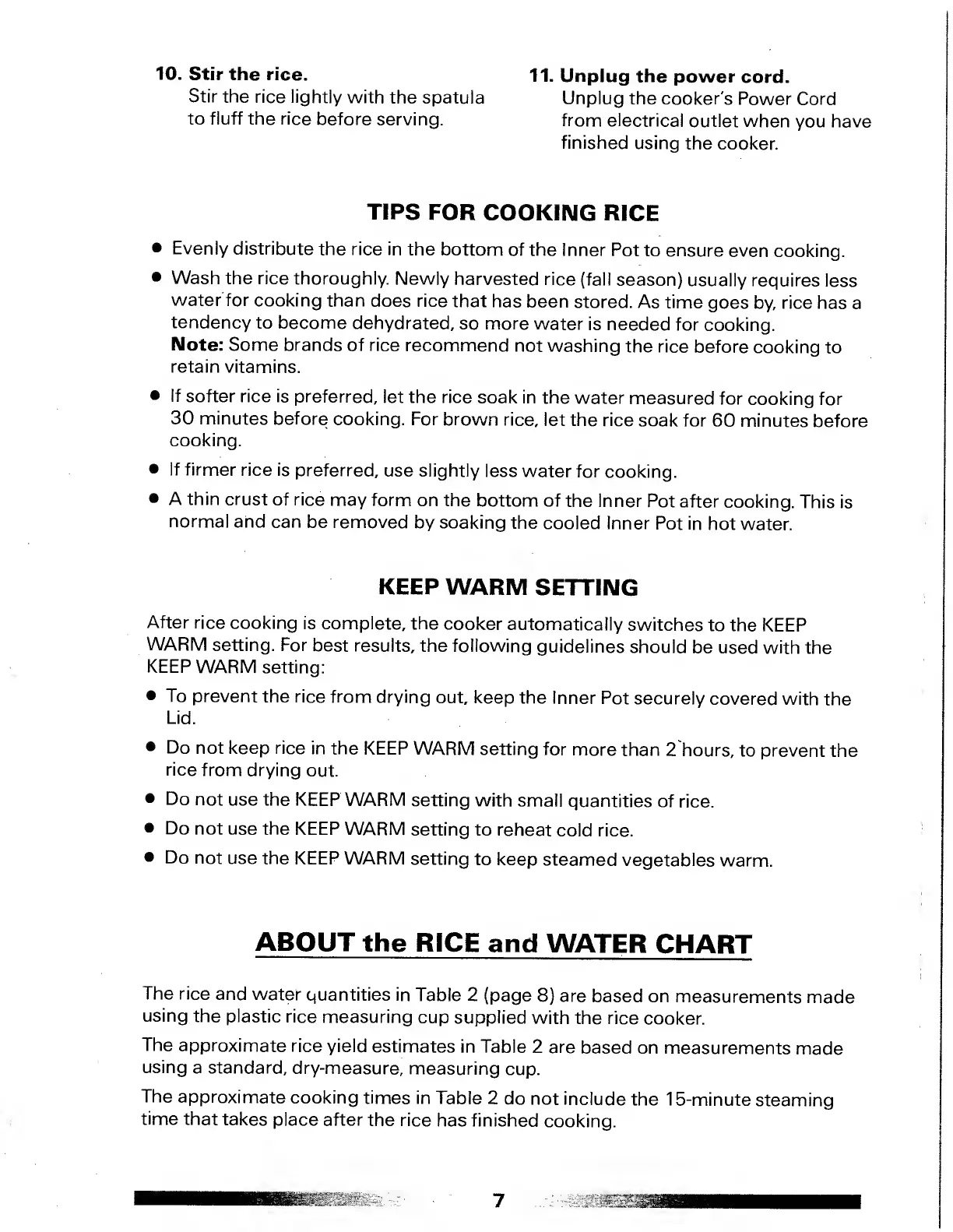 Sanyo EC-503 - Tips for Cooking Rice; Keep Warm Setting; About the Rice and Water Chart