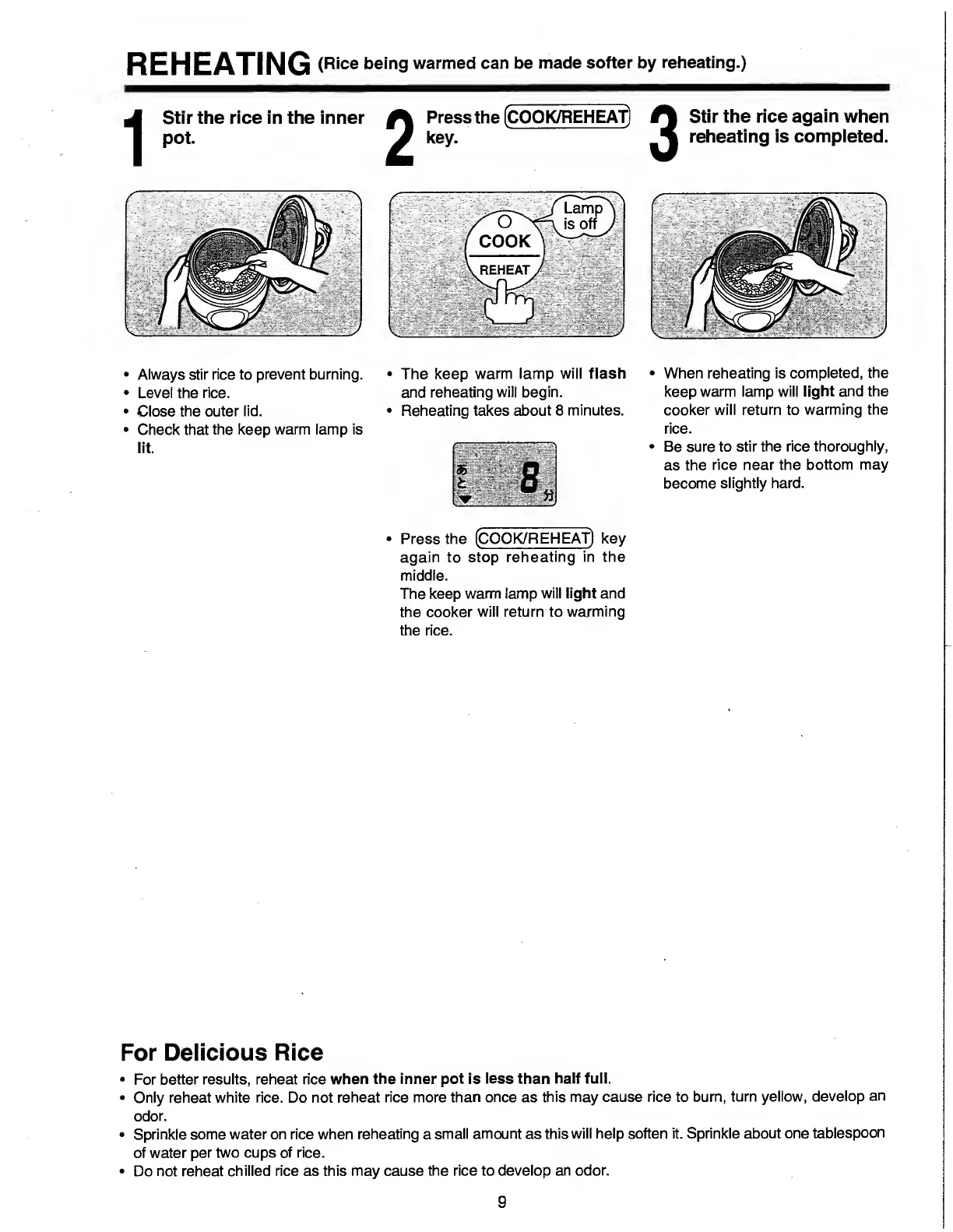 Sanyo ECJ-AC4E - Reheating; Reheating Procedure; Tips for Delicious Reheated Rice