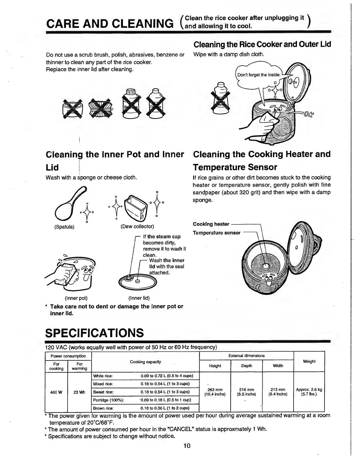Sanyo ECJ-AC4E - Care and Cleaning; Cleaning the Outer Lid and Cooker Body; Cleaning Inner Pot and Lid; Cleaning Heater and Sensor