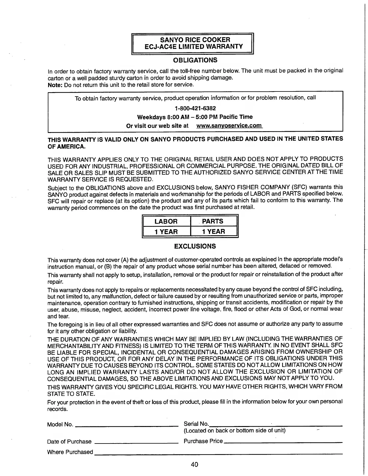 Sanyo ECJ-AC4E - Sanyo Rice Cooker ECJ-AC4 E Limited Warranty; Warranty Obligations and Service; Warranty Exclusions