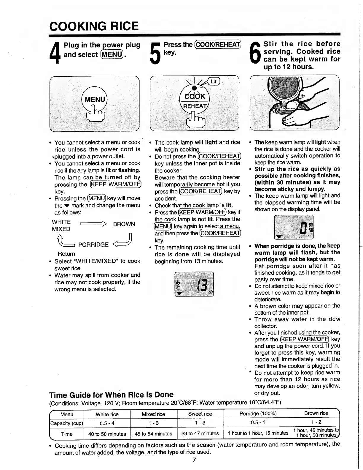 Sanyo ECJ-AC4E - Selecting Menu and Starting Cook; Keep Warm Function and Post-Cook Handling; Cooking Time Guide