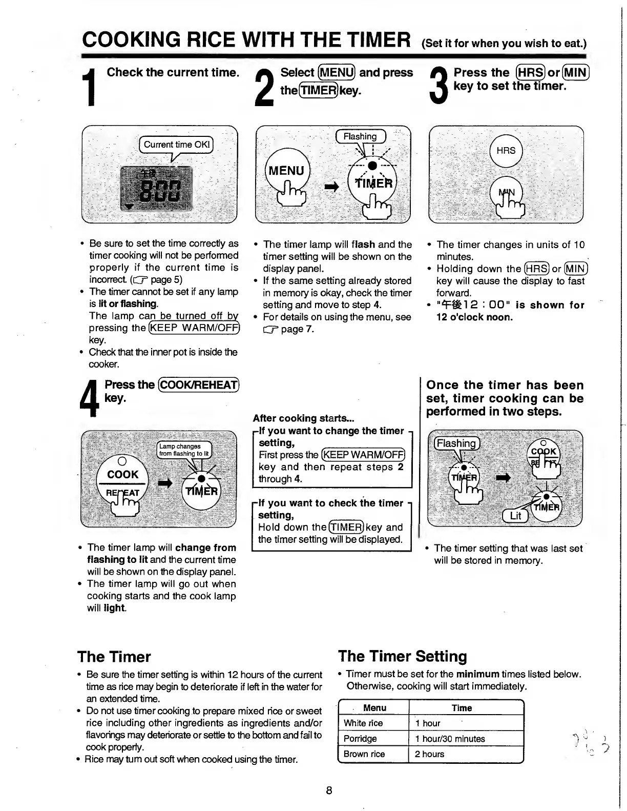 Sanyo ECJ-AC4E - Cooking Rice With the Timer; Setting the Timer for Delayed Cooking; Timer Operation and Memory; Timer Usage Guidelines