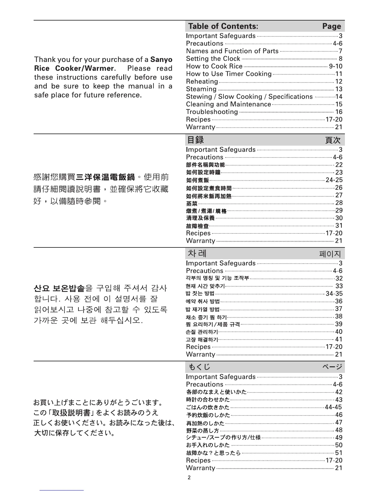 Sanyo ECJ-D100S - Table of Contents