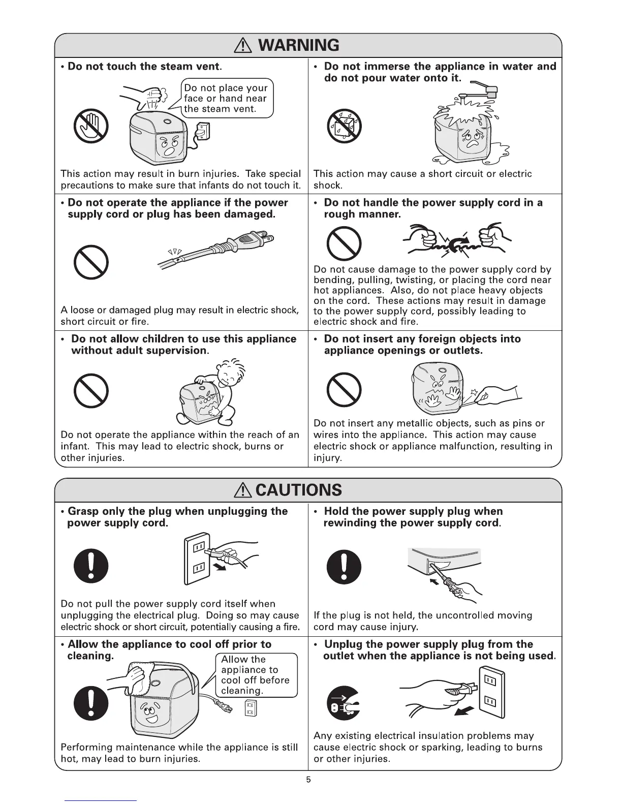 Sanyo ECJ-D55S - Additional Safety Warnings & Cautions; Burn and Shock Hazard Warnings; Child Safety and Foreign Object Insertion; Handling and Cooling Cautions