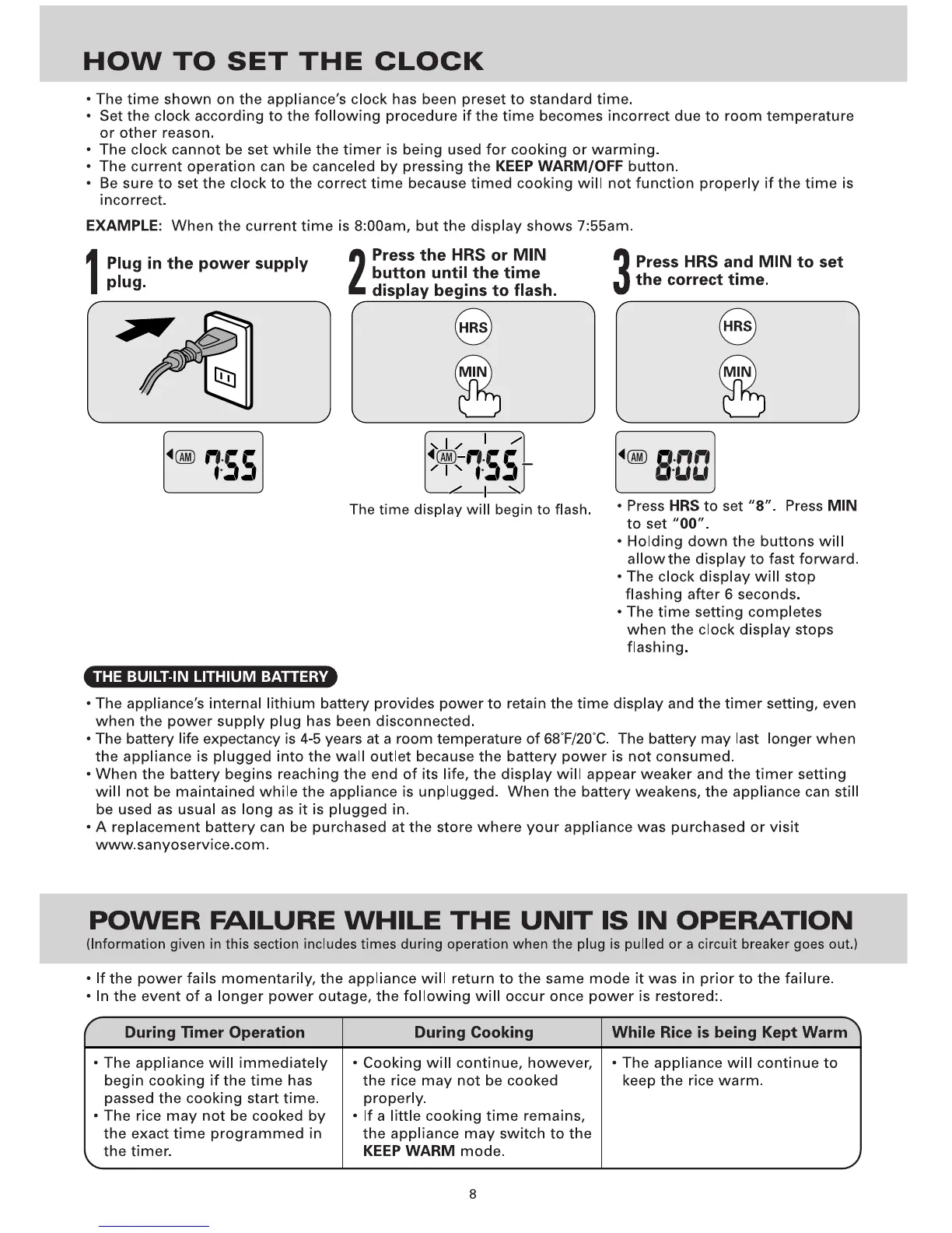 Sanyo ECJ-D55S - How to Set the Clock; Clock Setting Procedure; Internal Battery and Power Failure