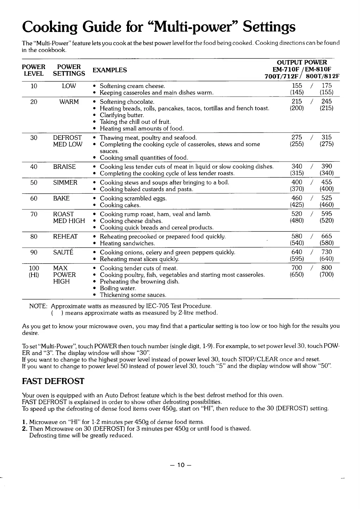 Cooking Guide for “Multi-power” Settings