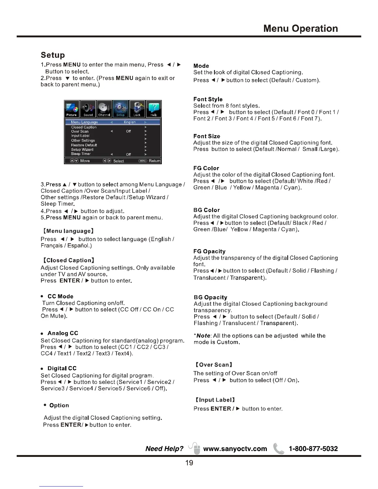 Sanyo FVD48P4 - Setup; Closed Caption; CC Mode; Analog CC
