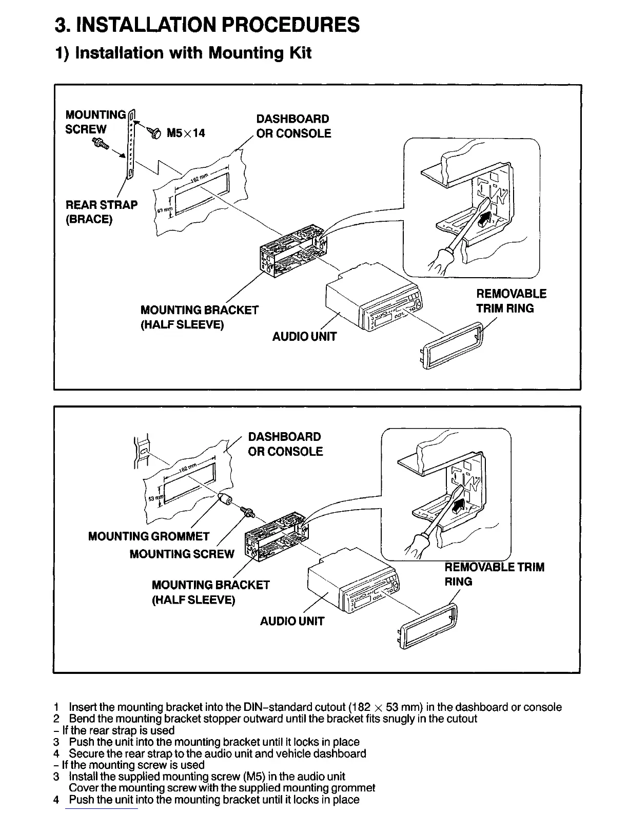1 Inset-t the mounting bracket into the DIN-standard cutout (182 x 53 mm) in the dashboard or console