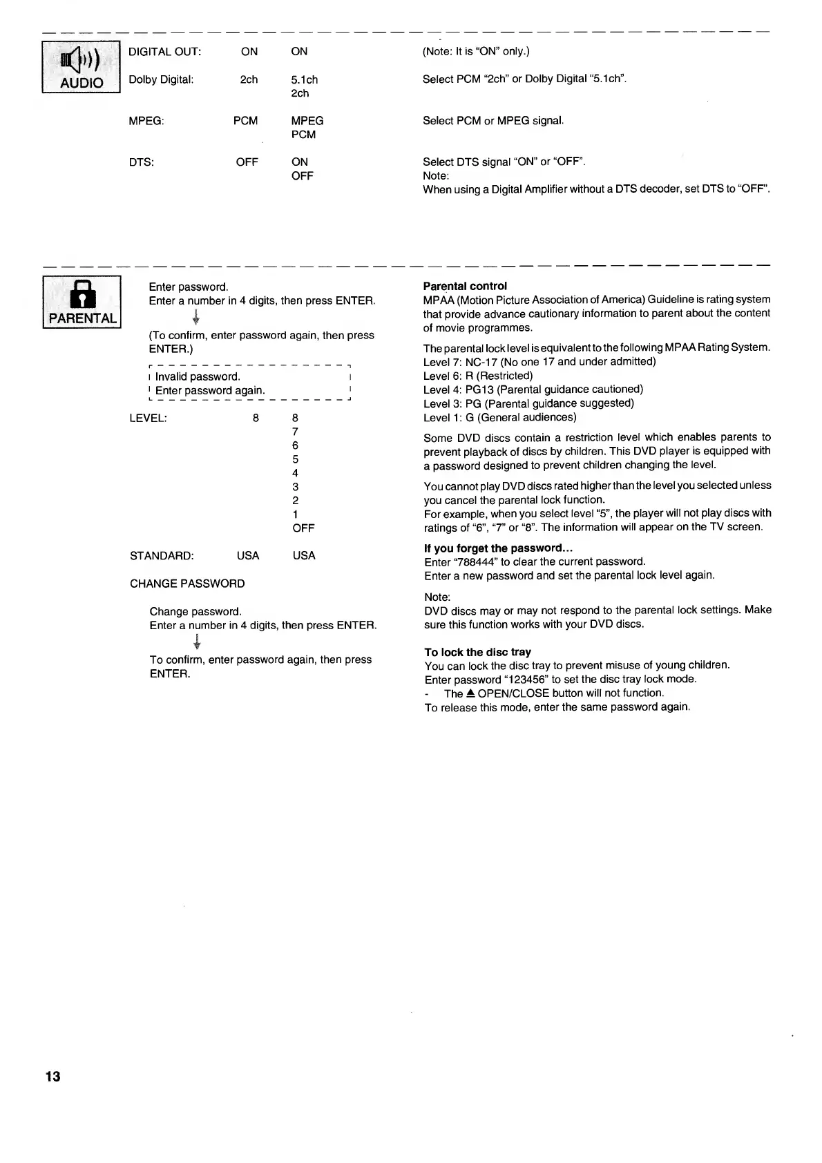 Sanyo HTD-5201 - SYSTEM SETTINGS; Audio Output Settings; Parental Control Setup; Password Management