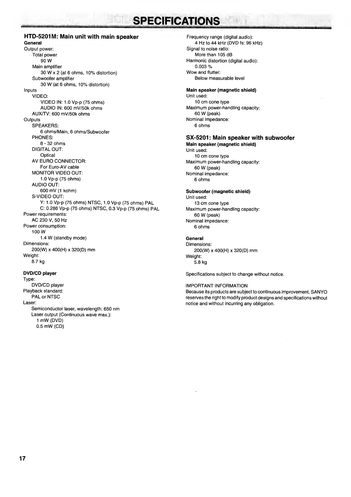 Sanyo HTD-5201 - Specifications