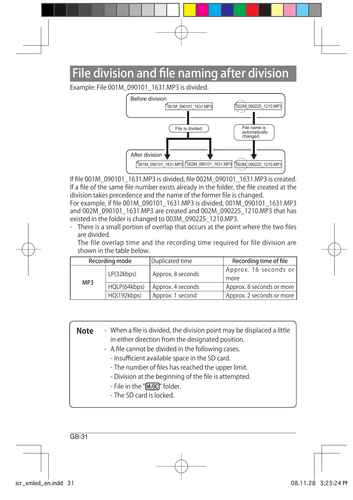 Iffile001M0901011631.MP3isdivided,file002M0901011631.MP3iscreated.