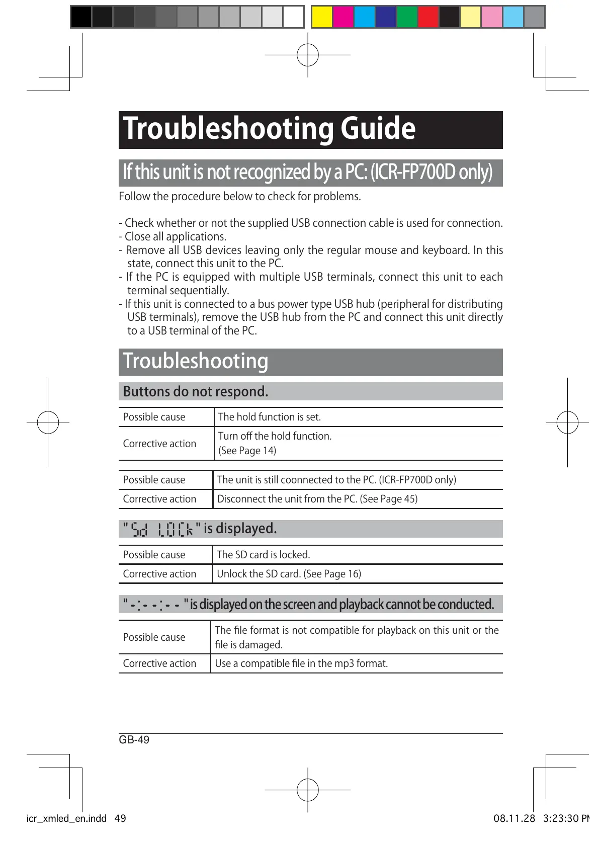 Possiblecause TheunitisstillcoonnectedtothePC.(ICR-FP700Donly)