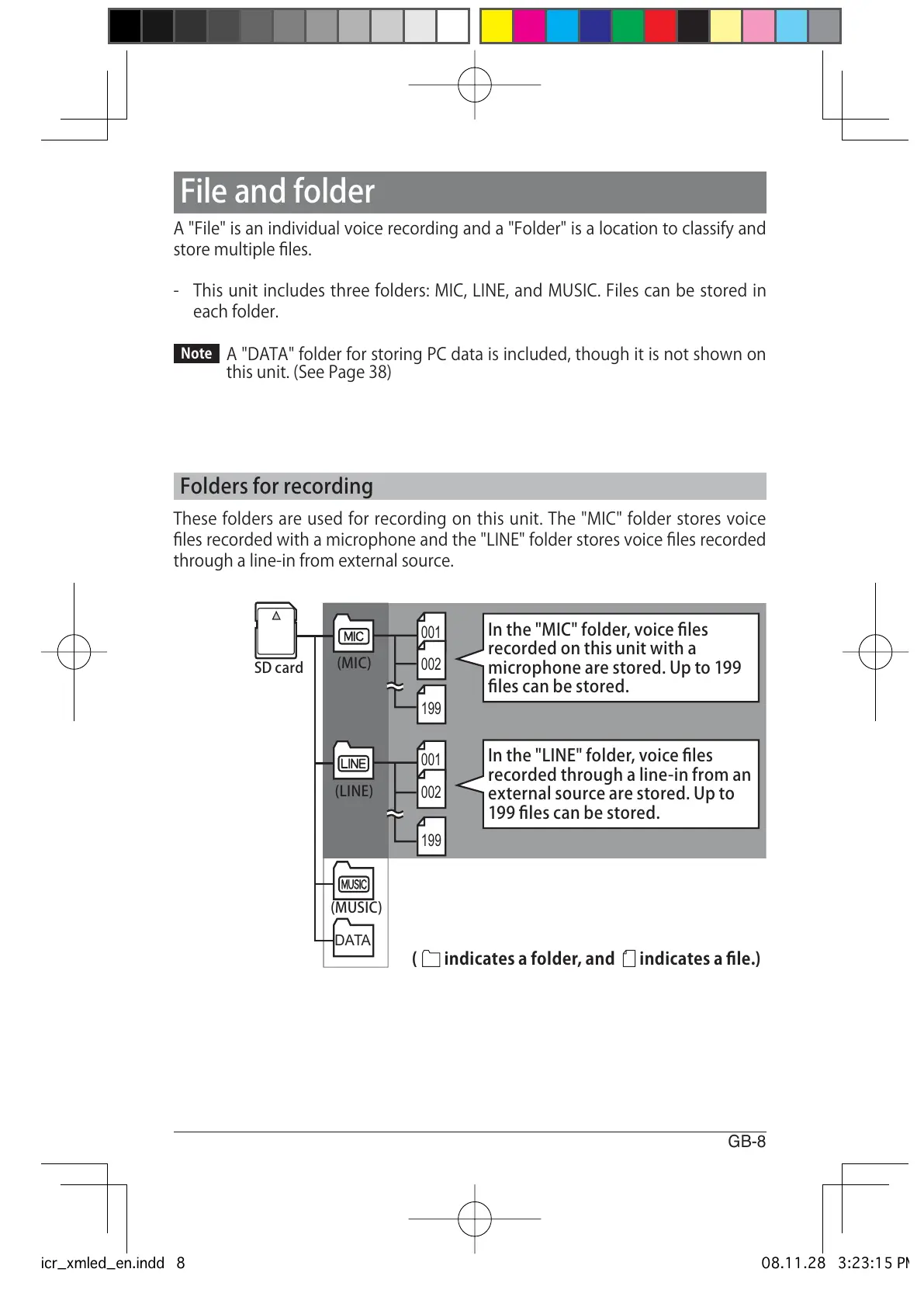 - Thisunitincludesthreefolders:MIC,LINE,andMUSIC.Filescanbestoredin