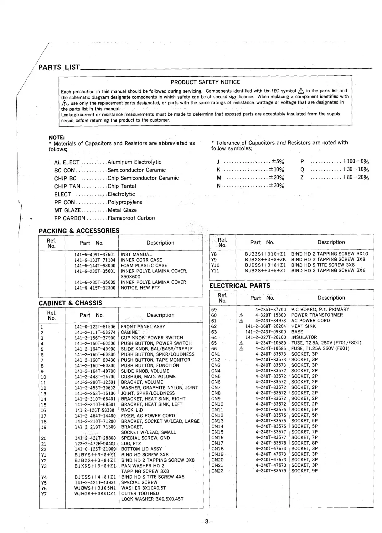 Sanyo JA 477 - Parts List; Packing and Accessories; Cabinet & Chassis