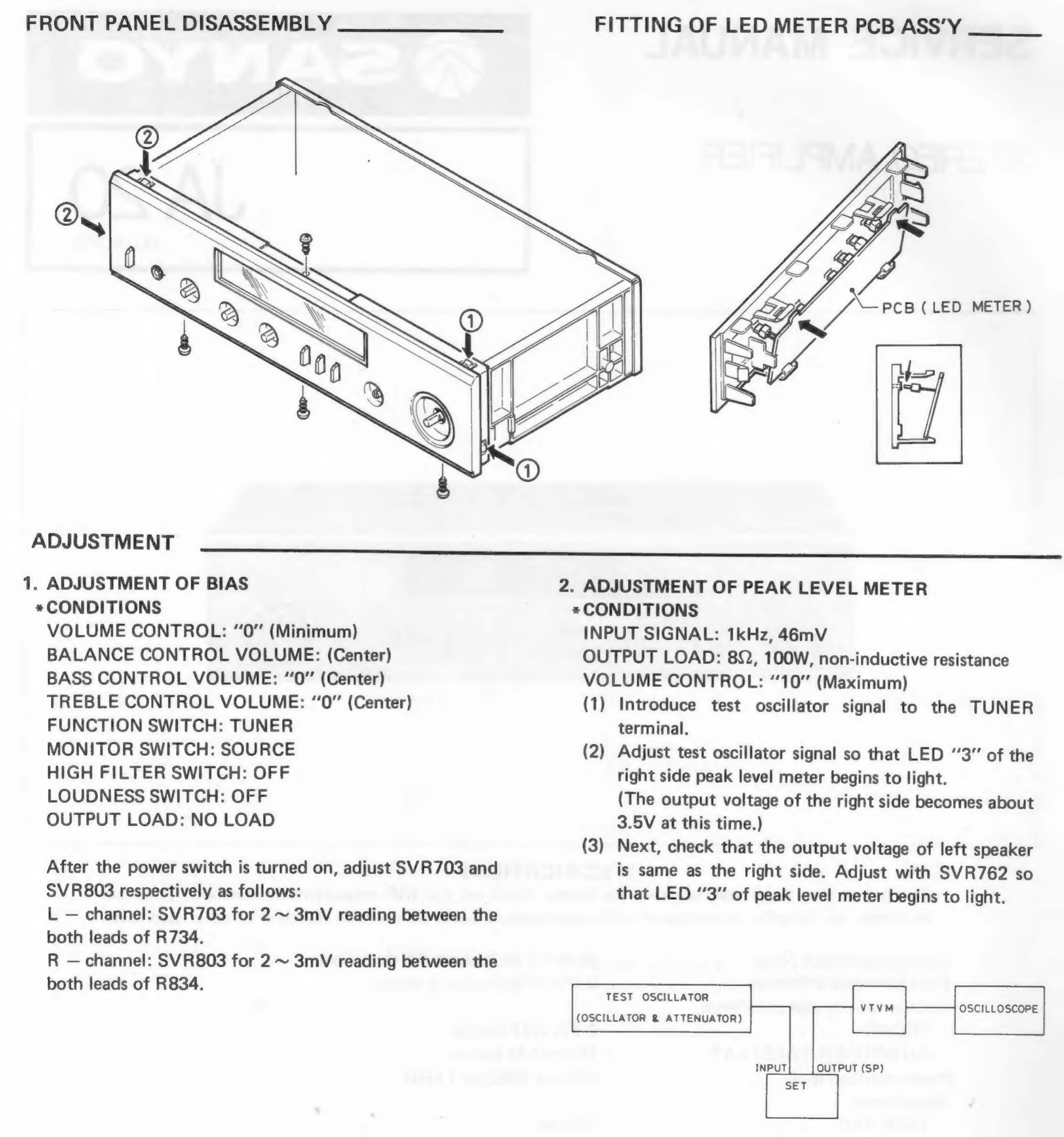 Sanyo JA20 - Front Panel Disassembly; LED Meter PCB Assembly; Adjustment Procedures; Bias Adjustment