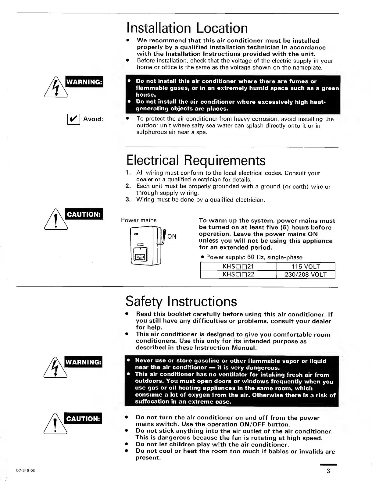 Sanyo KHS1822 - Installation Location; Electrical Requirements; Safety Instructions