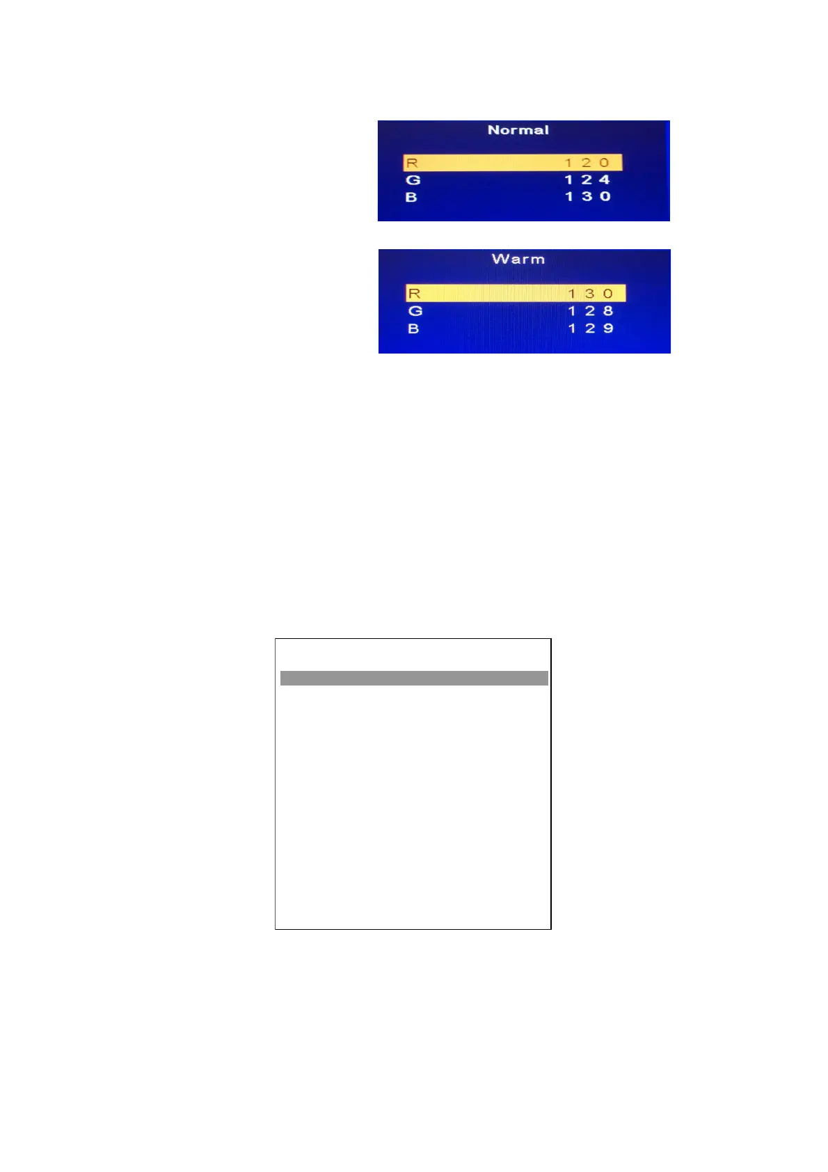 Press up and down key can move high light item from Cool ->Warm -> Normal ->Shipping-> NV clear-> Full