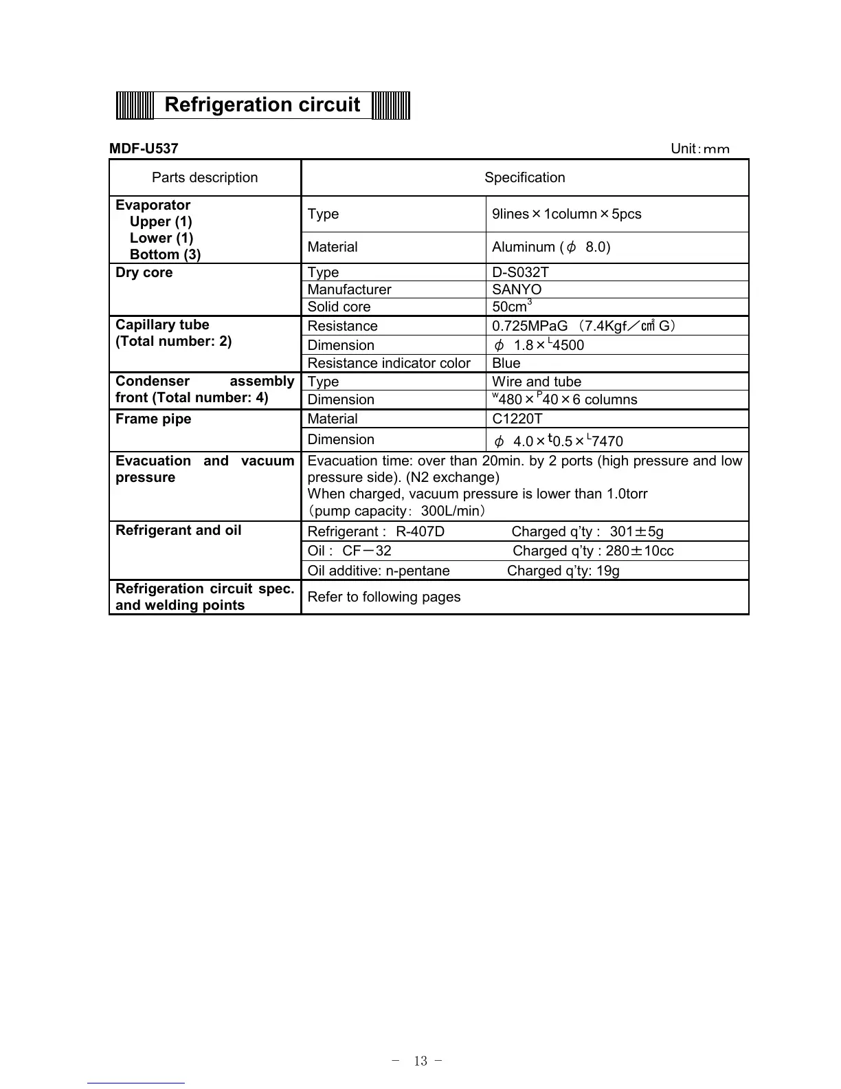 Refrigerant : R-407D Charged q’ty : 301±5g